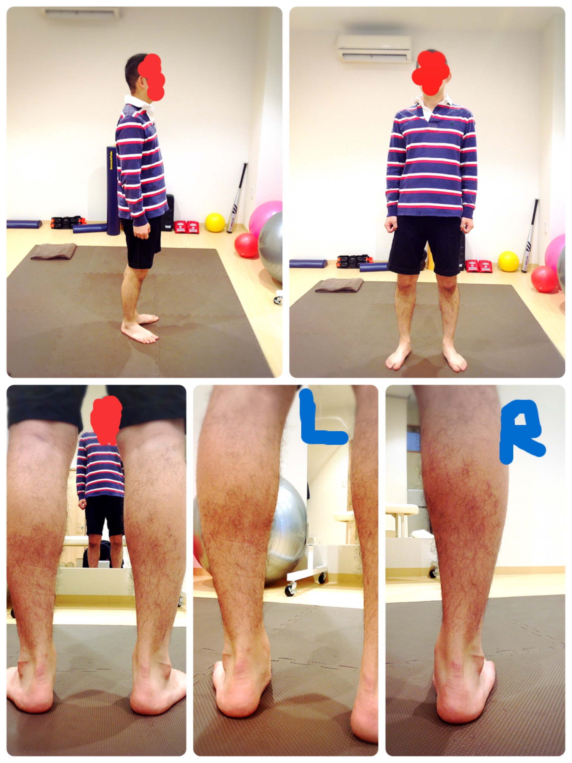 右足と左足の違い。(左足の土踏まずがつぶれています。原因としては足の関節位置の問題、股関節まわりの筋力の問題、ヒザの捻じれ、肋骨まわりの問題など人によって様々です。)